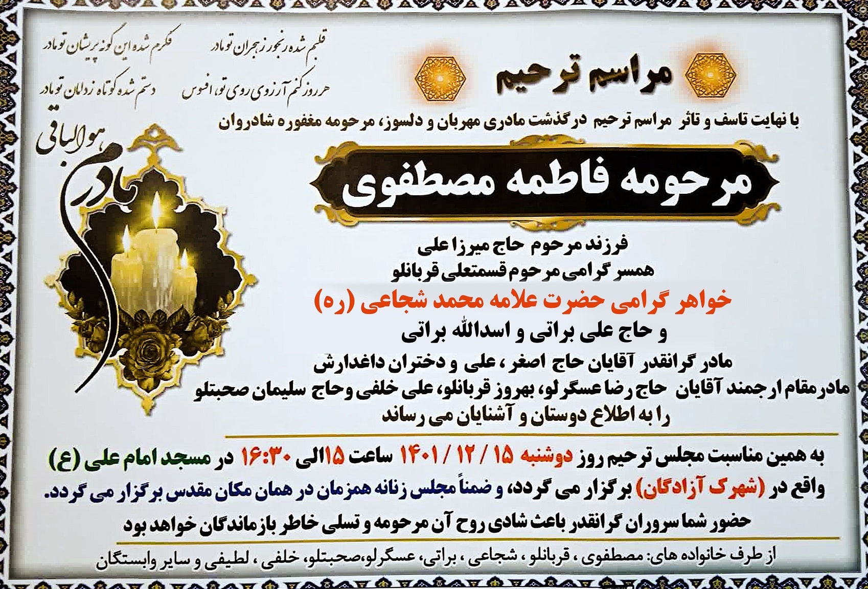 به مناسبت درگذشت خواهر مکرمه حضرت علامه آیت الله شجاعی (ره) مراسم ترحیم و بزرگداشت در شهر زنجان برگزار خواهد شد.